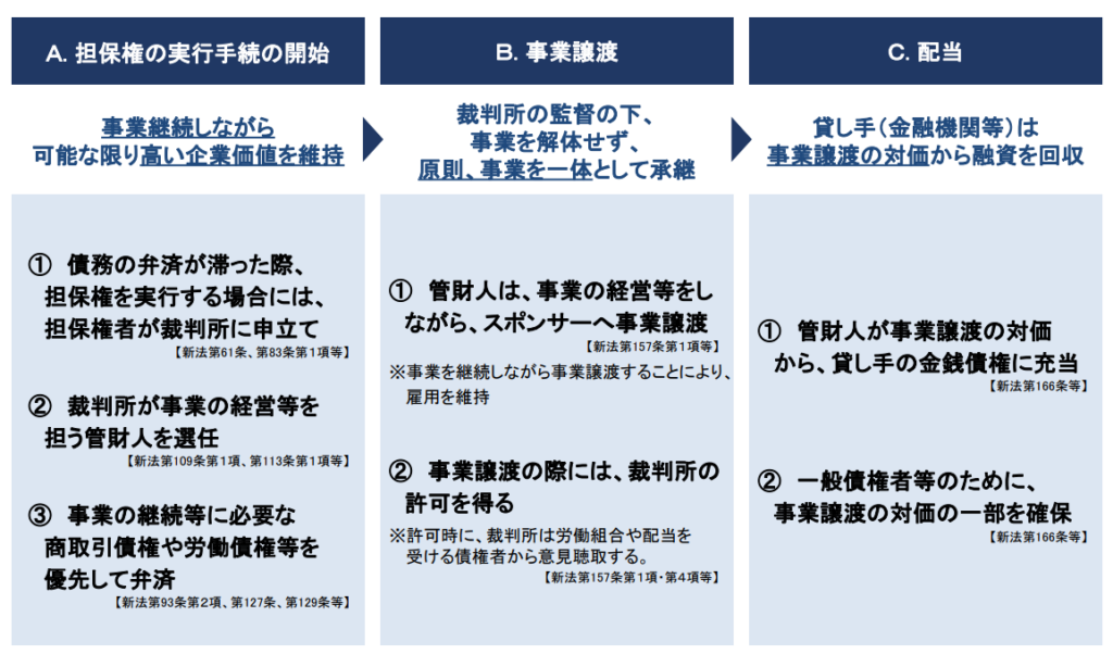 ポイントは、債務者の事業財産を解体して、バラバラに処分するのではなく、事業を一体として評価し、第三者に譲渡することで、事業の継続性を確保し、再建型の担保としての役割を果たすという点です。