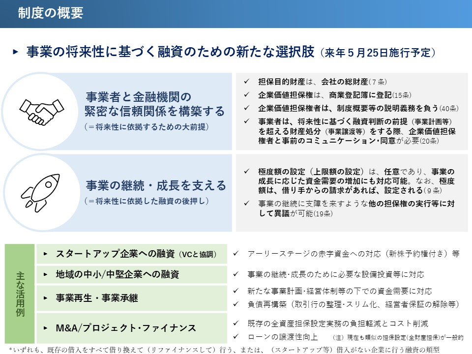 この法律は2026年5月25日から施行される予定であり、企業価値担保権は不動産担保や経営者の個人保証に依存した融資慣行の是正を目的としています(事業性融資の推進等に関する法律第1条)。