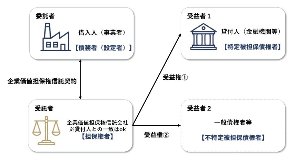 企業価値担保権の設定は、債務者である会社を委託者とし、企業価値担保権信託会社を受託者として、両者の間で締結される企業価値担保権信託契約によらなければなりません(事業性融資の推進等に関する法律第8条第1項)。いわゆる担保権信託(セキュリティトラスト)を前提としております。※信託契約に関係する当事者は下図の通り。